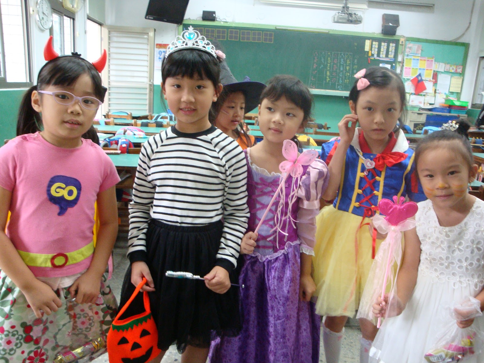 星期五歡樂的英語課~喔耶! 我們一群小蘿蔔頭妝扮一番,到輔導處、學務處走秀表演,拿可口的點心去囉!嗯!感恩三位熱心的媽媽幫忙同學變妝、著裝,淳恩媽媽還帶來了彩繪工具呢!真有趣!只見不到一會兒功夫,班上就出現了好幾隻貓咪啦!嘻!嘻!